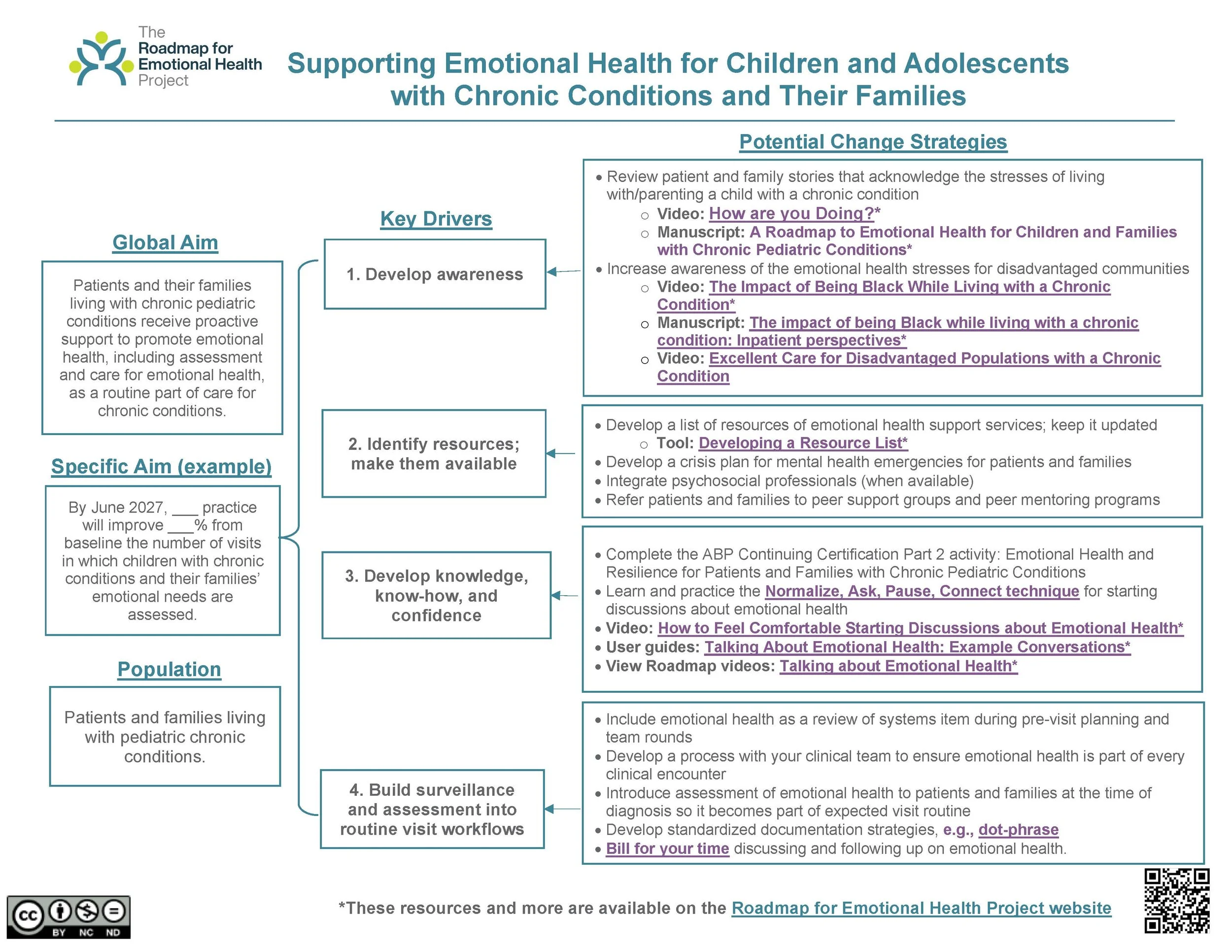 The Key Driver Diagram, Readiness Checklist, and Roadmap Pathway are designed to be used together for individuals to visualize, assess, and plan to improve the emotional health of children and adolescents with chronic conditions and their families.